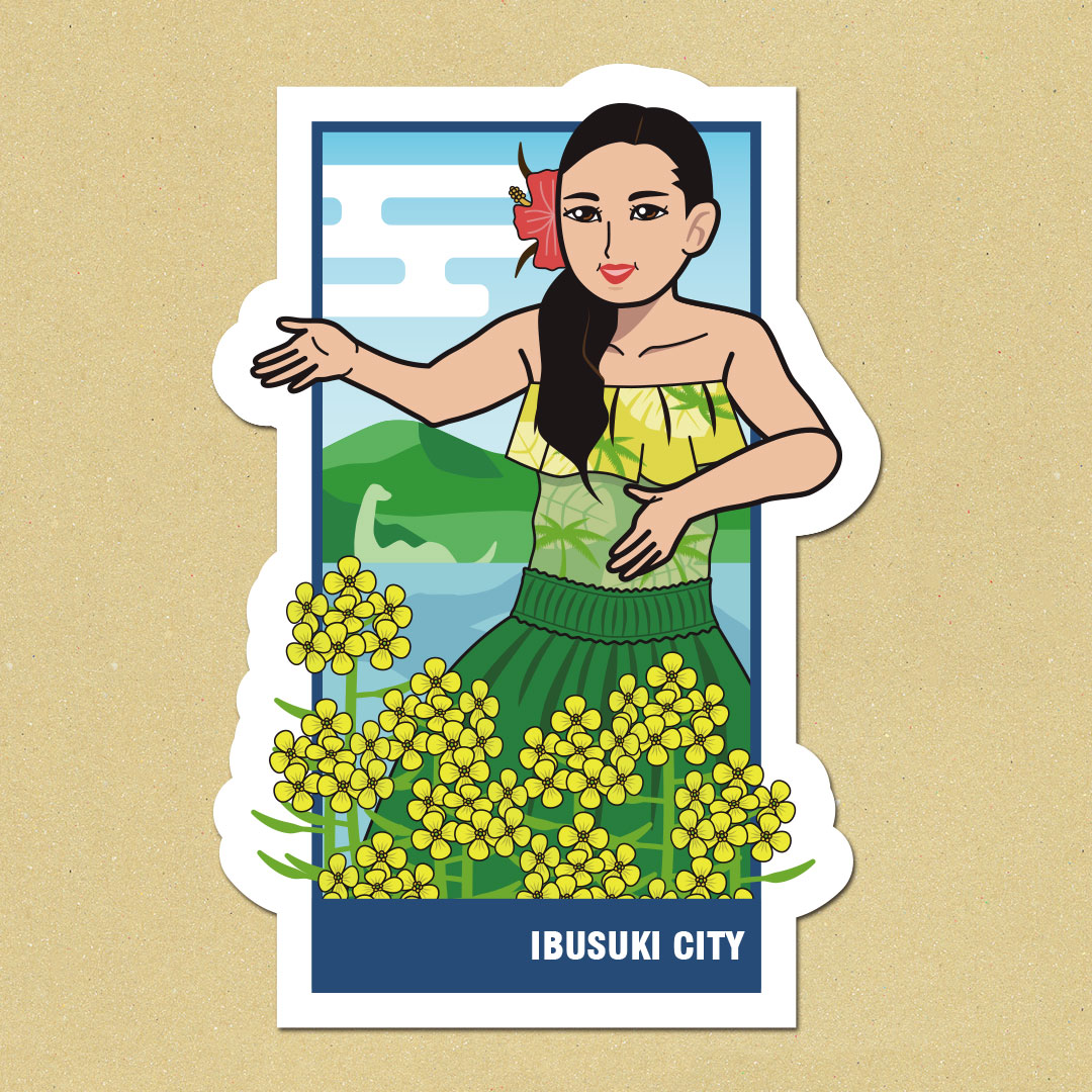 The “Ibusuki Onsen” logo was created from scratch using a thin Gothic font as the base, and some of the horizontal and vertical lines in the kanji were differentiated with red. To represent a rock bath, a rock frame was created with a pattern brush and placed. Steam and soap bubbles were added around the rocks to create a hot spring atmosphere. A hibiscus, the flower of Ibusuki-shi, was placed in the bottom right of the frame.
